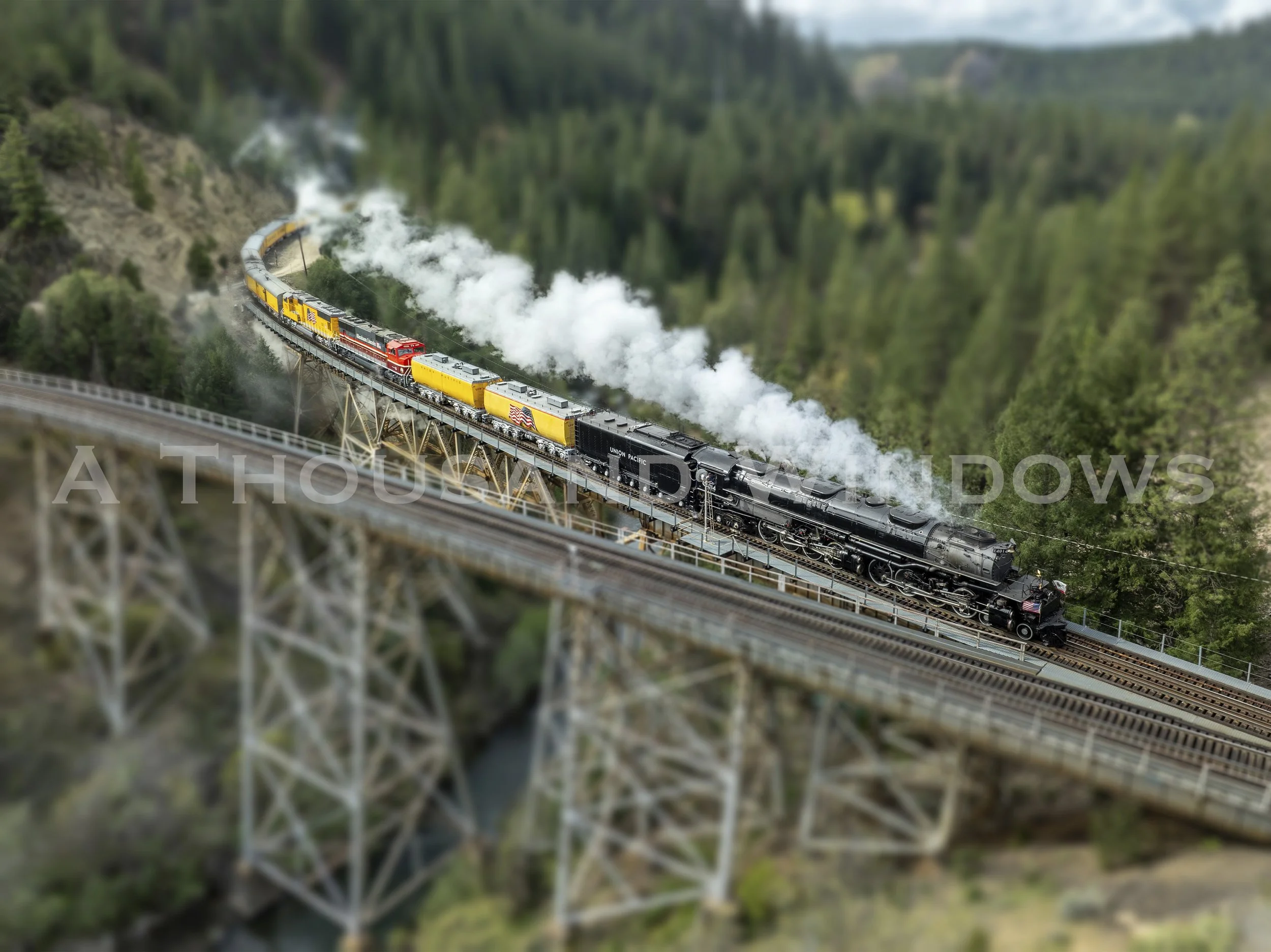 Union Pacific’s “Big Boy 4014,” the largest operating steam locomotive in the world, crossing the iconic Keddie Wye bridge in the Feather River Canyon of Northern California. Photographed during the Big Boy’s coast-to-coast tour in 2026, this photo is edited in “tilt shift” style, giving the illusion of a toy train in a model landscape.