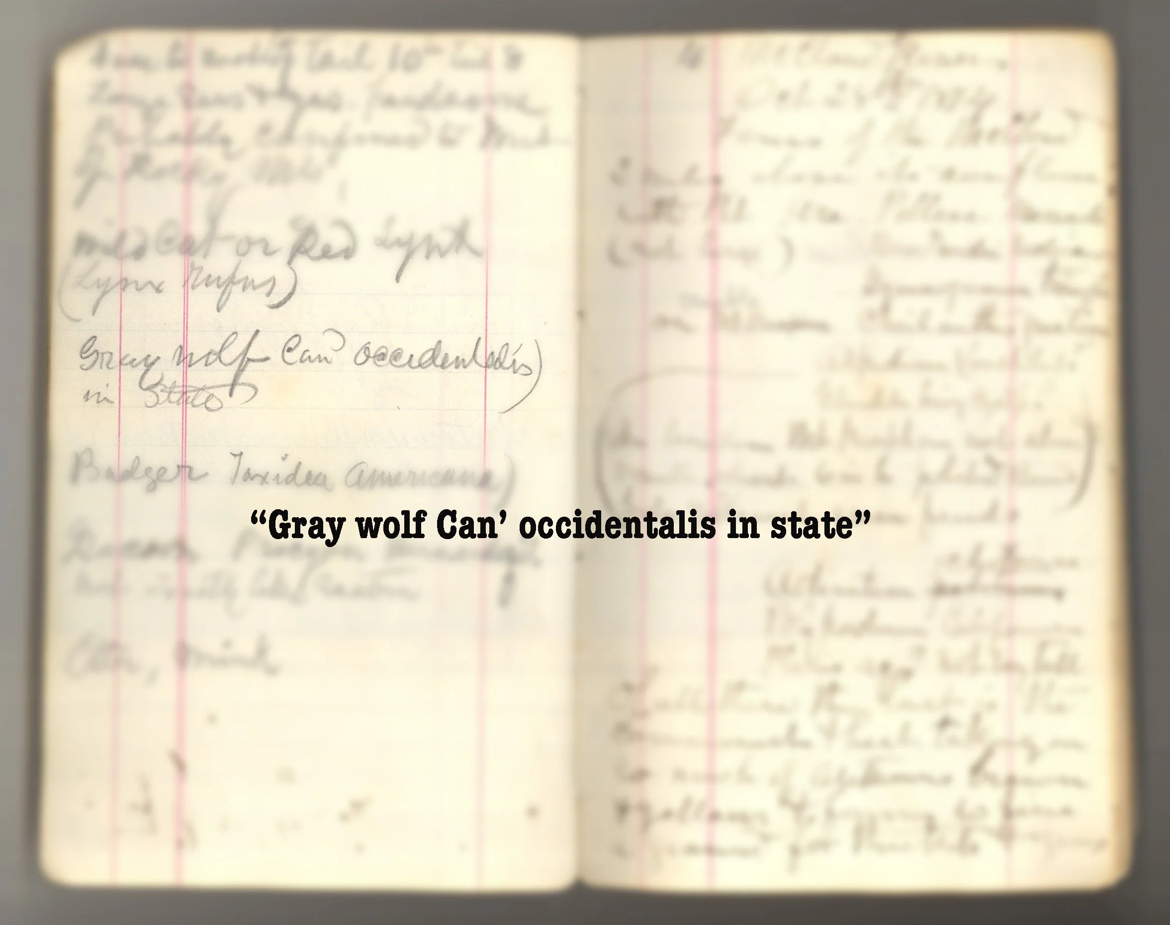 The “Can’” is certainly shorthand for Canis lupus. But the very specific “occidentalis in state” is an amazing notation. This is not someone who saw a wolf and didn’t know what he was looking at. This is John Muir. Misidentifying Canis lupus occidentalis for John Muir would be like Michael Jordan accidentally playing with a WNBA sized basketball and not noticing. This wasn’t a post for attention on Facebook, it was merely a notation of a species whose presence in his beloved California was very noteworthy. “Occidentalis in state” is not a phrase that can be taken in more than one way. And when the source is John Muir, the idea that this could be a taxonomy mistake is, in my opinion, laughable. He would go on over the coming weeks to have run-ins with these wolves on the sheep hunt, with this new knowledge of their presence in the state already noted in his journal as he wrote about the “big gray ones.”